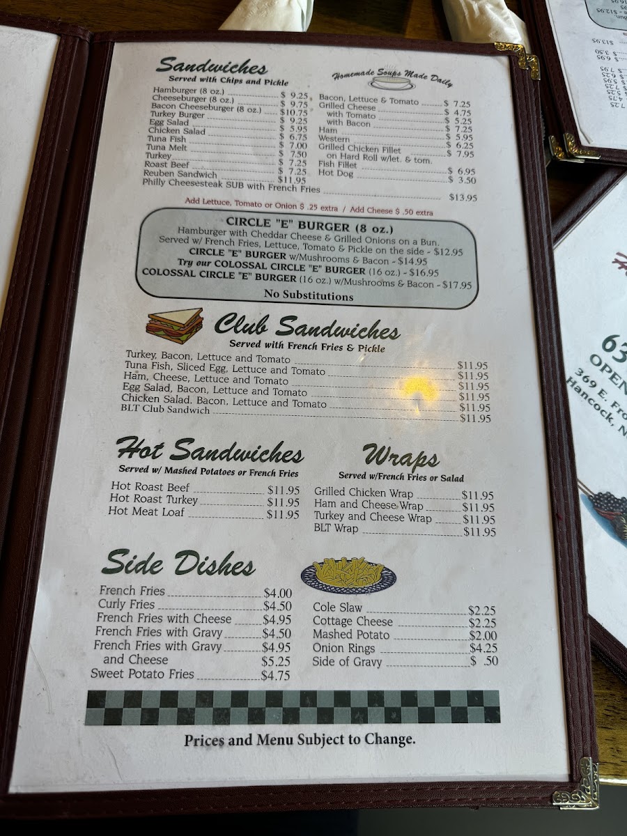 Circle E Diner, located at 369 E Front St in Hancock, NY, stands as a cherished local gem with a rich history and a welcoming, family-operated atmosphere. From the moment you step inside, the diner exudes a warm, nostalgic charm—accentuated by a quaint clock that chimes "Let It Be" by The Beatles every hour, blending comfort and character in one cozy space.